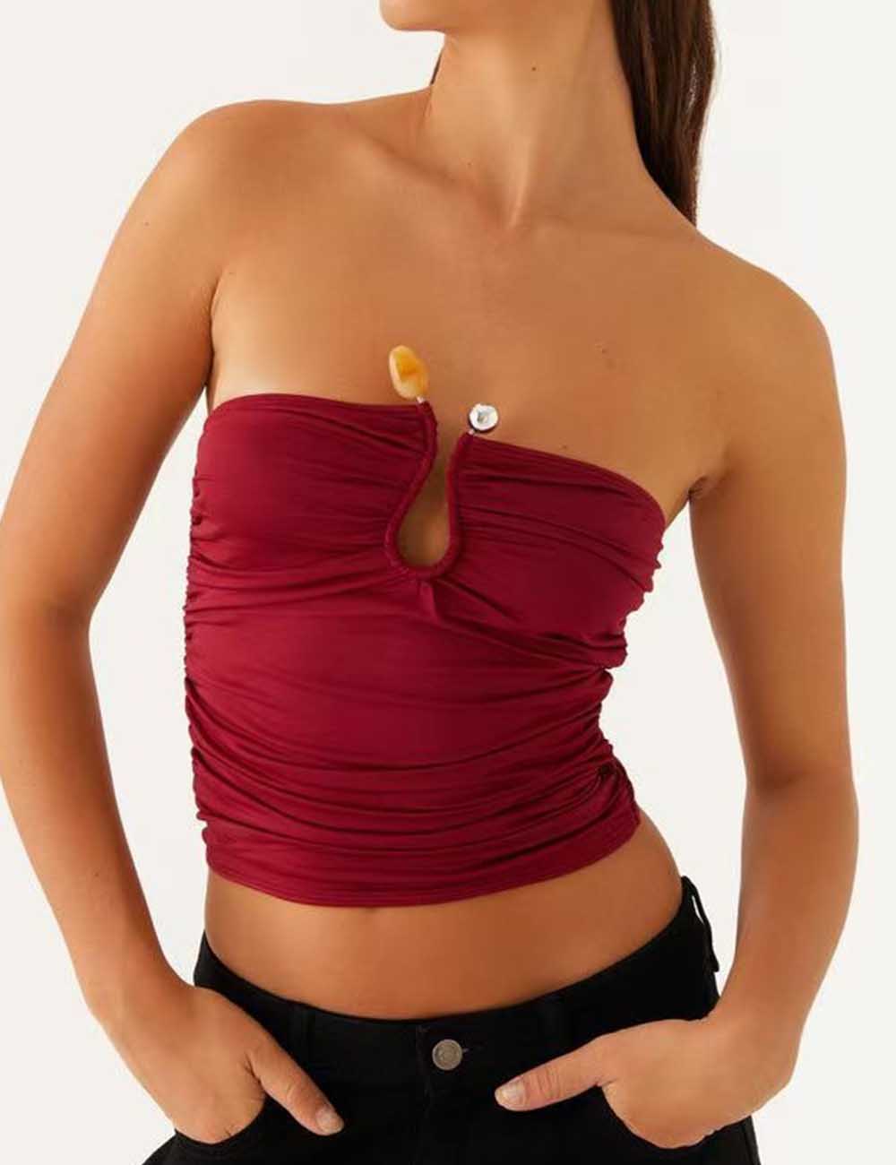 Ladies Solid Color Wrinkle Keyhole Cut Out Tube Top