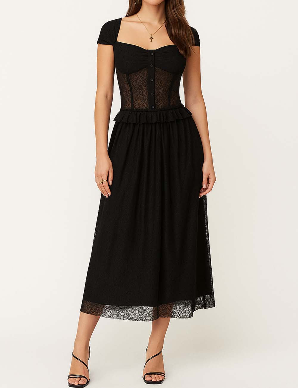 Ladies Lace Sheer Sweetheart Neckline Cap Sleeves Midi Dress