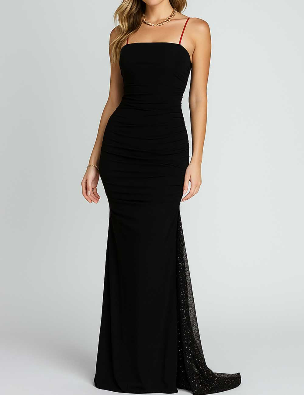 Ladies Party Ruched Rhinestone Spaghetti Strap Bodycon Maxi Dress
