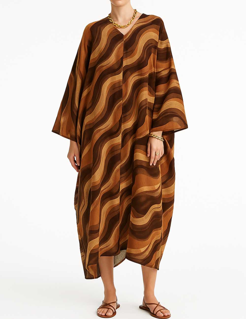 Ladies Wave Print Kaftan Back Deep V Maxi Dress