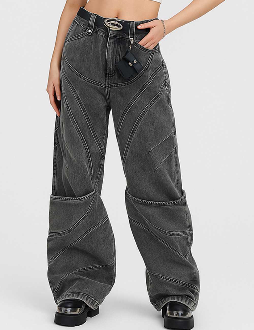 Ladies Button Pocket Baggy Wide Leg Denim Pants